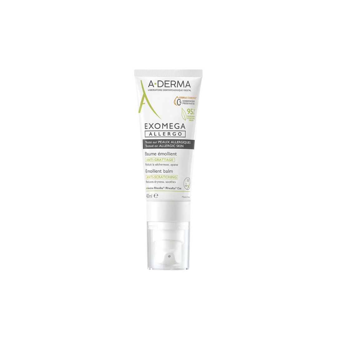 Aderma Exomega Allergo emolijentni balzam za suhu, osjetljivu i atopiji sklonu kožu. Umiruje iritacije, smanjuje svrbež i jača kožnu barijeru. Pogodno od rođenja, bez parfema i sastojaka životinjskog podrijetla.