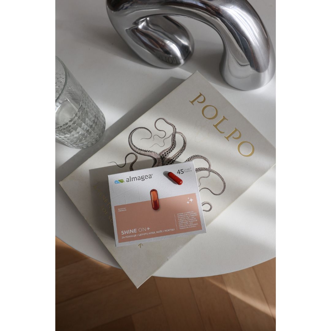 Almagea Shine On+ dodatak prehrani s patentiranim ekstraktima SkinAx² i Keranat, vitaminima, mineralima i koenzimom Q10. Podrška sjaju, elastičnosti kože i zdravom izgledu kose.