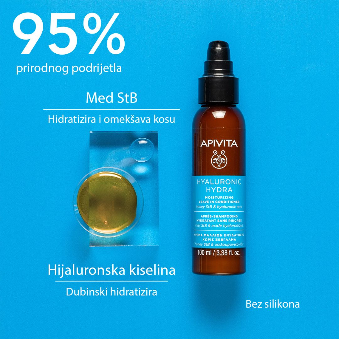 Apivita hidratantni regenerator bez ispiranja s hijaluronskom kiselinom i medom hidrira kosu, kontrolira frizz i štiti od toplinskog oblikovanja.