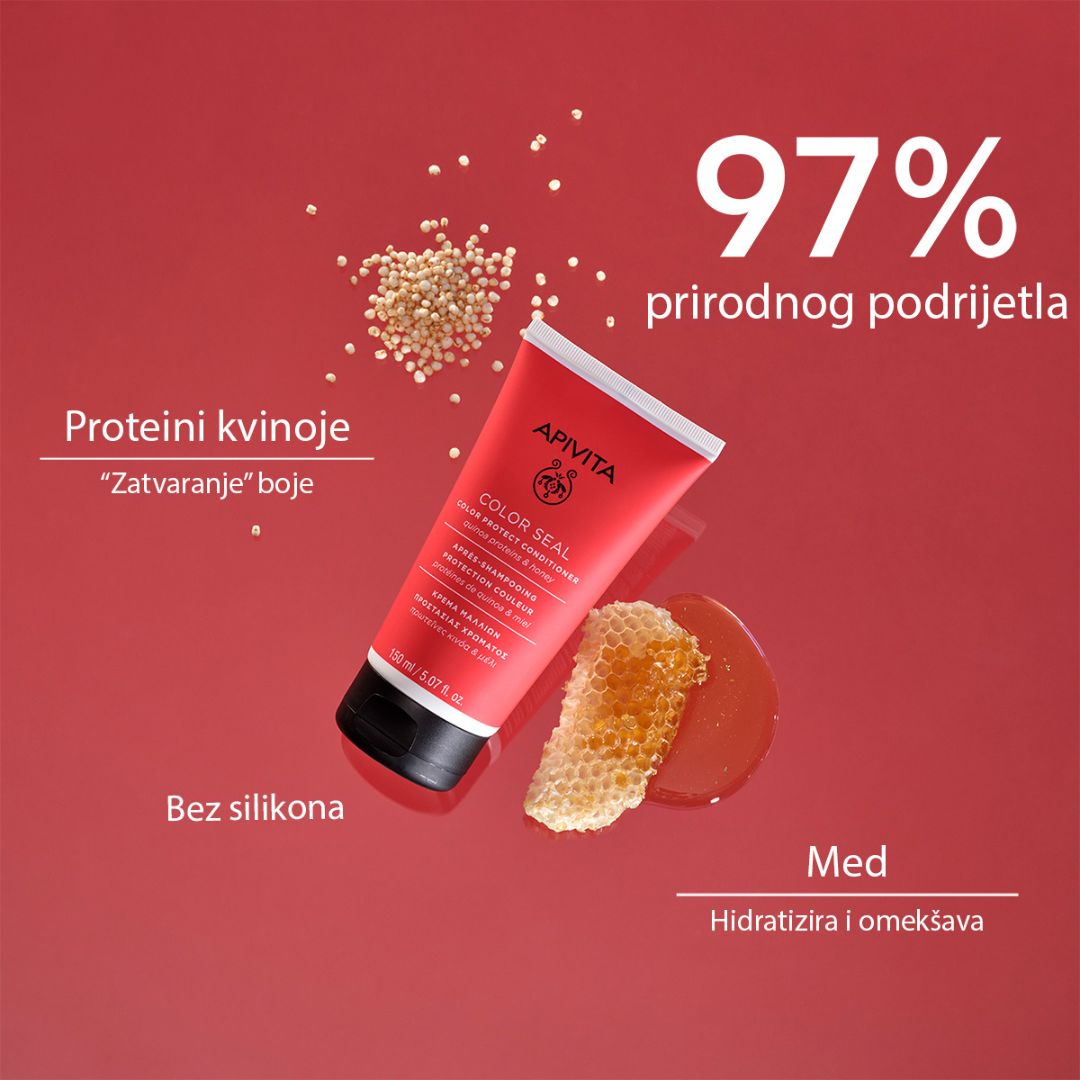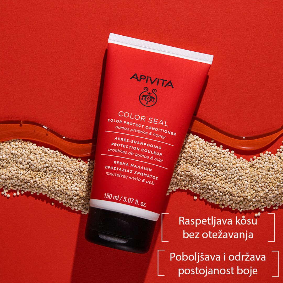 APIVITA Regenerator za zaštitu obojane kose s proteinima kvinoje i medom pomaže očuvati intenzitet boje, hidratizira kosu i vraća joj sjaj.