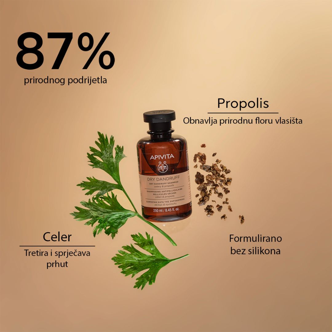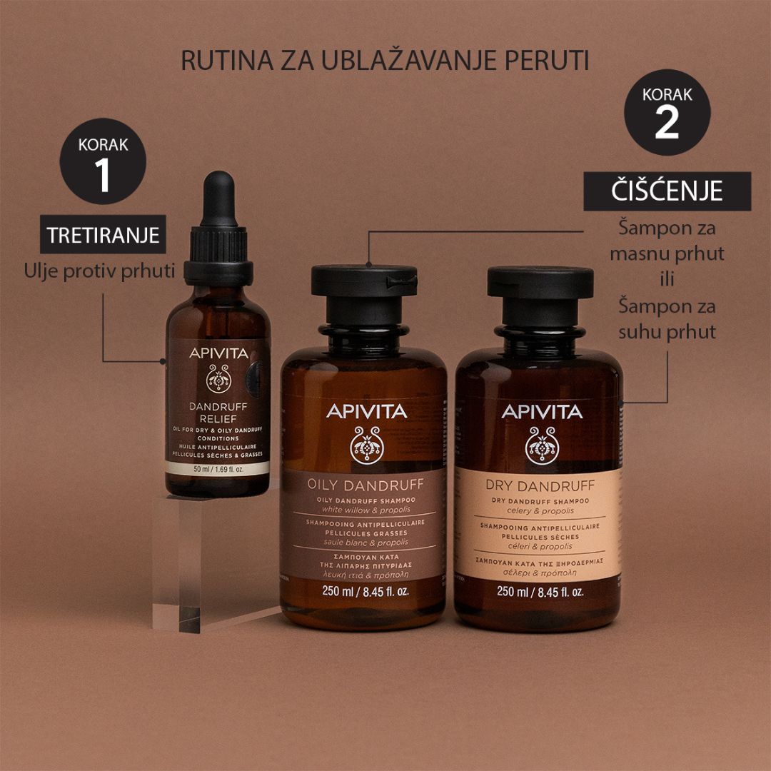 Apivita šampon protiv suhe prhuti s celerom i propolisom pomaže ukloniti prhut, hidratizira vlasište i ublažava svrbež.