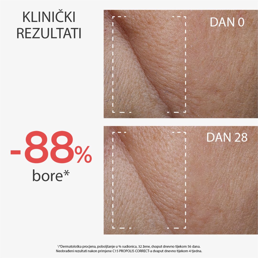 Sastav uključuje i patentirani Propolis AoX-CR kompleks, koji dodatno podržava antioksidativno djelovanje formule i doprinosi očuvanju zdravog izgleda kože.
