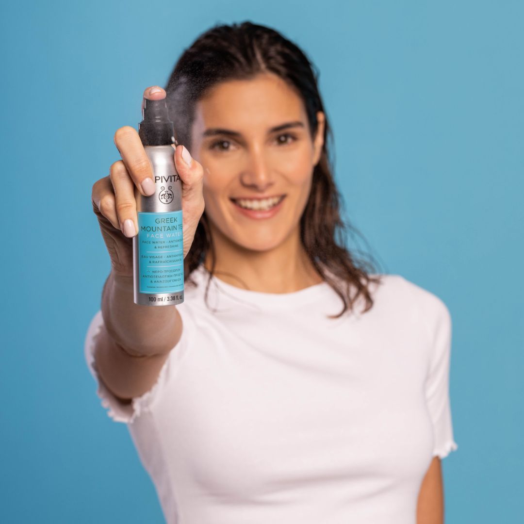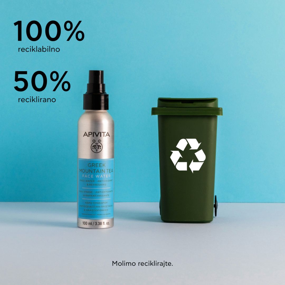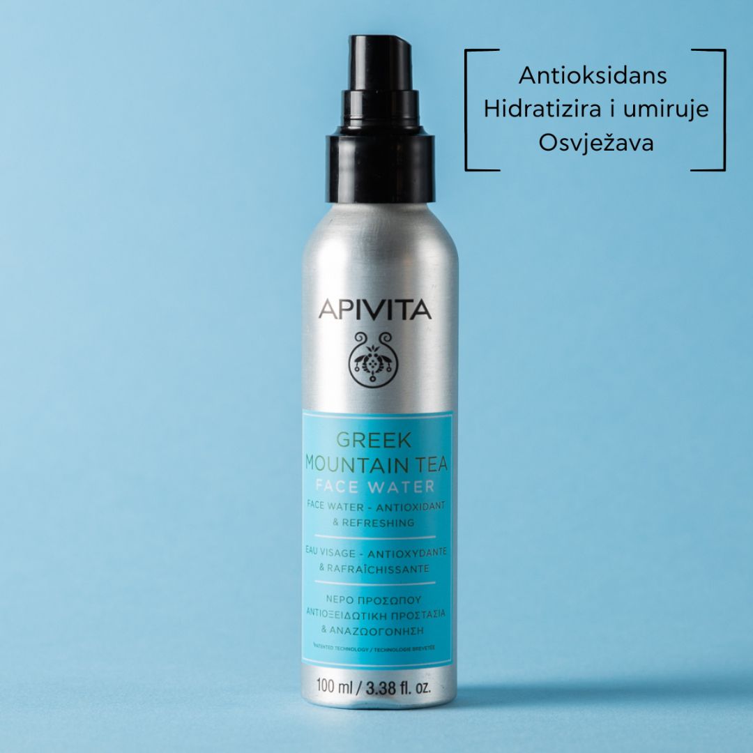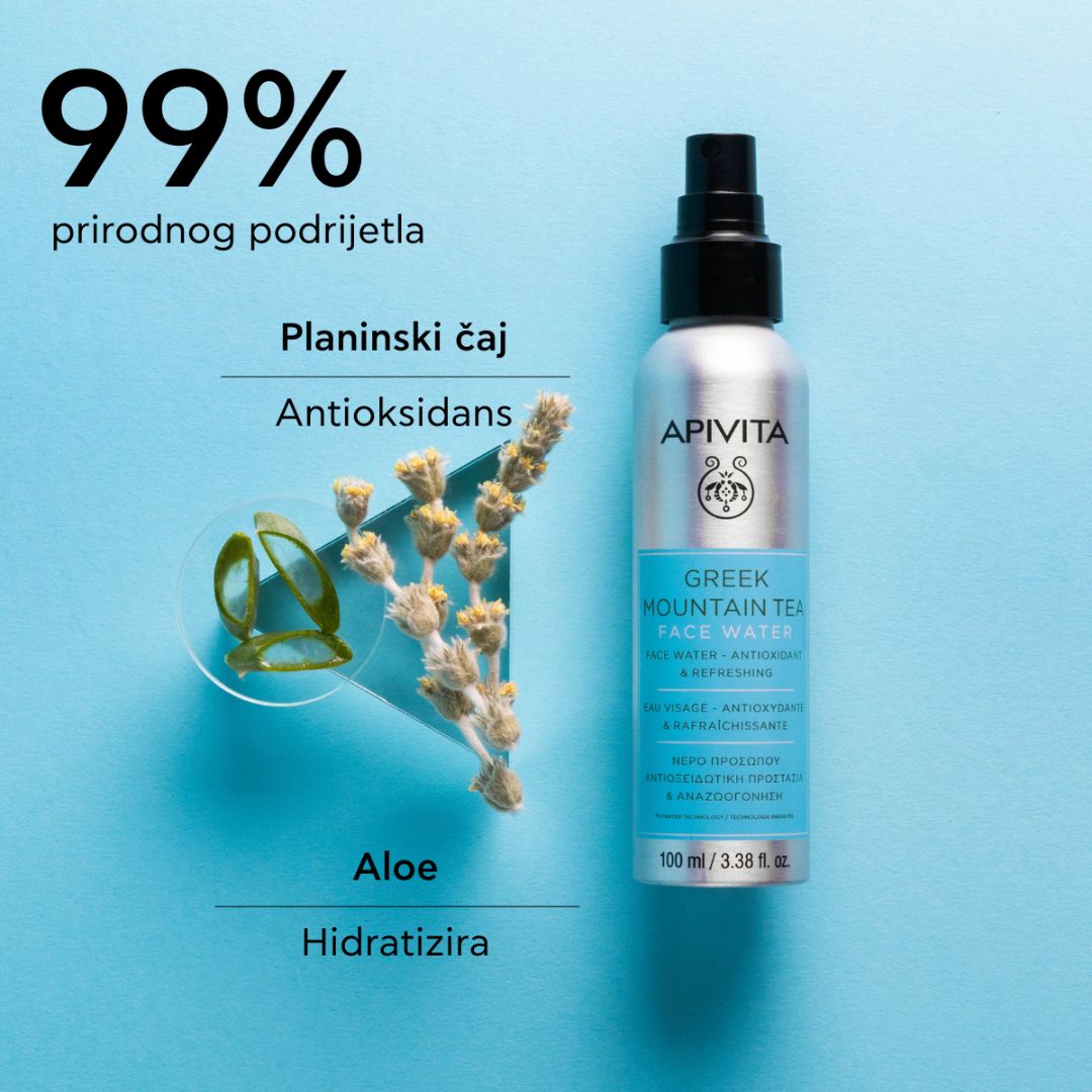 Apivita vodica za lice s grčkim planinskim čajem hidratizira, osvježava i štiti kožu od oksidativnog stresa.