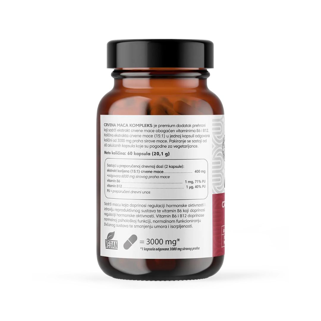 Bioandina Crvena Maca kompleks su kapsule koje sadrže aktivirani ekstrakt crvene mace (15:1) i vitamine B6 i B12. Količina aktiviranog ekstrakta u jednoj kapsuli odgovara količini od 3000 mg praha sirove mace, a što u dvije kapsule (preporučenoj dnevnoj dozi) iznosi 6000 mg.