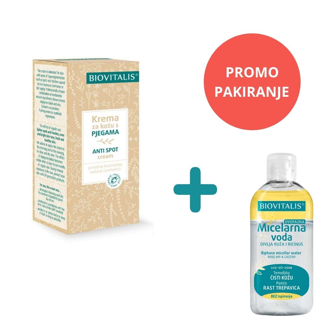 *PROMO PAKIRANJE! Dodajte 1 pakiranje BIOVITALIS Krema za kožu s pjegama 40 ml u košaricu – drugi proizvod BIOVITALIS Dvofazna micelarna voda 100 ml, dobivate besplatno. Ponuda vrijedi do isteka zaliha.
