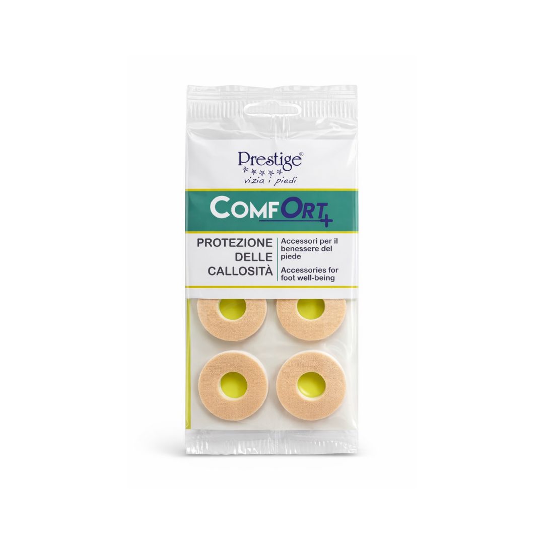 COMFORT+ štitnici za žuljeve i kurje oči – 4 samoljepljiva prstena od lateksa koji smanjuju pritisak, trenje i nelagodu pri hodanju.