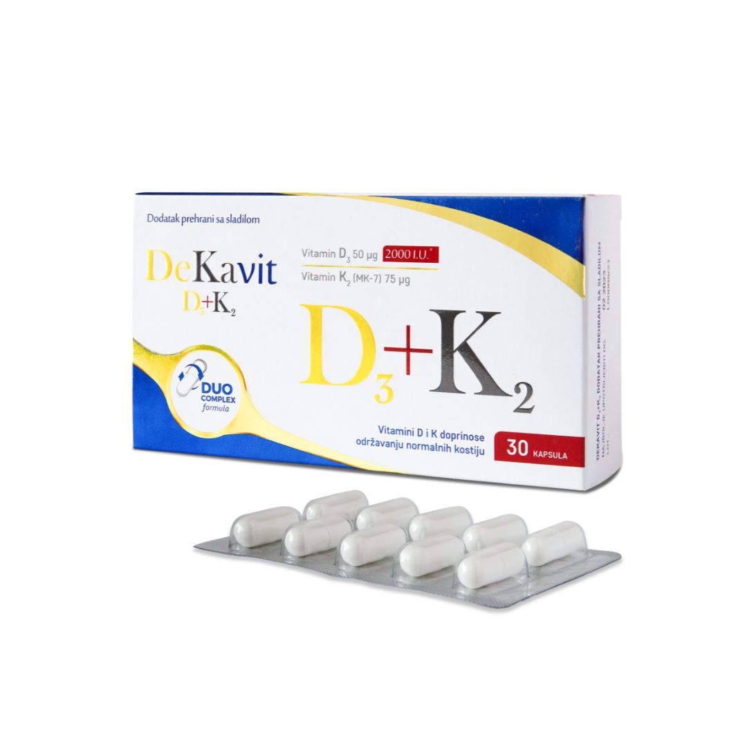 Dekavit D3 + K2 kapsule sadrže vitamin D3 (2000 IU) i vitamin K2 MK-7 za potporu imunološkom sustavu i zdravlju kostiju. Dodatak prehrani u inovativnoj duo complex kapsuli.