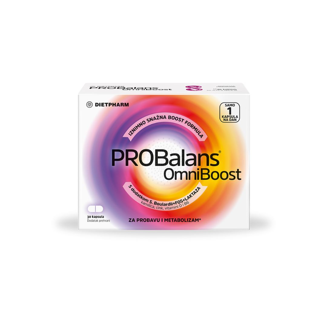 PROBalans OmniBoost je dodatak prehrani s iznimno snažnom boost formulom za naprednu podršku probavi, metabolizmu i imunitetu. Samo 1 kapsula na dan sadrži 9 milijardi dobrih bakterija, kulturu živih kvasaca S. Boulardii, fruktooligosaharide (FOS), laktazu, kamilicu s apigeninom, cink te vitamine D i B6.