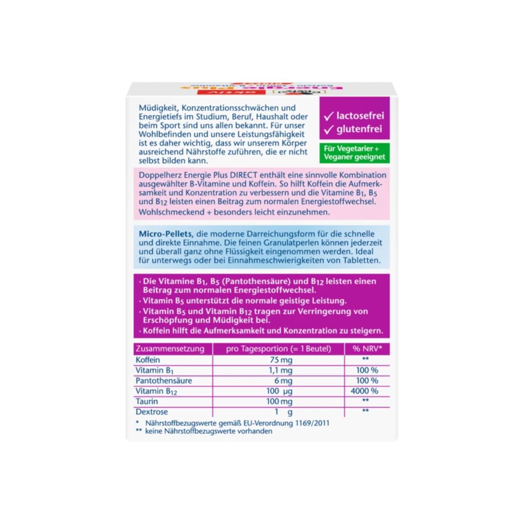 Doppelherz aktiv Energie Plus DIREKT je dodatak prehrani s kofeinom, taurinom, dekstrozom i B vitaminima u obliku mikro granula za brzo povećanje energije, budnosti i smanjenje umora.