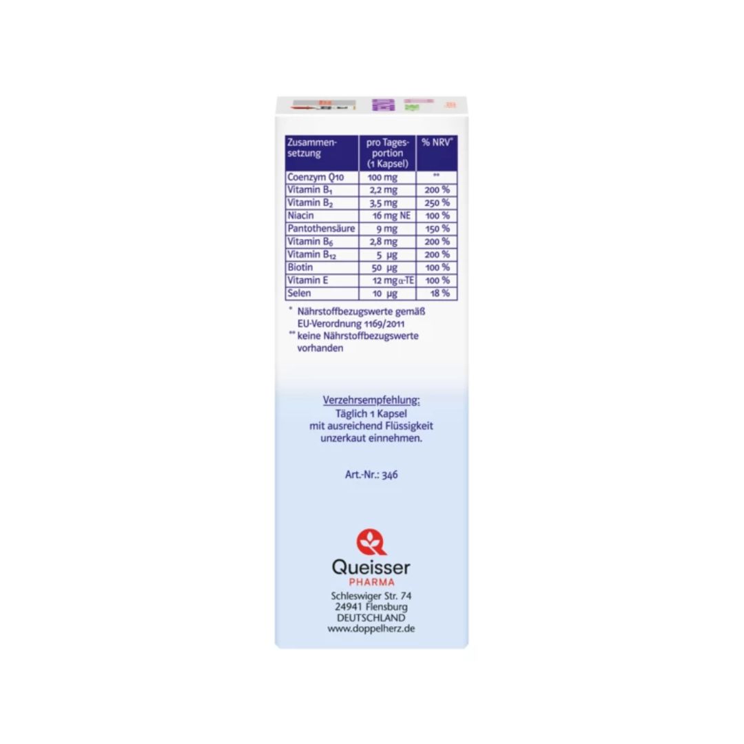 Doppelherz system Koenzim Q10 100 s vitaminima u jednoj kapsuli sadrži 100 mg koenzima Q10, B vitamine, vitamin E i selen. Idealan za osobe s povećanim tjelesnim i mentalnim naporima, kao i za one koji žele očuvati vitalnost i energiju, osobito u zreloj dobi.