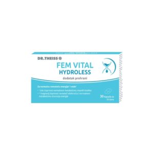 Dr. Theiss Fem Vital Hydroless je dodatak prehrani koji sadrži cink, magnezij, sok brusnice, jabučni ocat i ekstrakt koprive za normalnu ravnotežu energije i vode.
