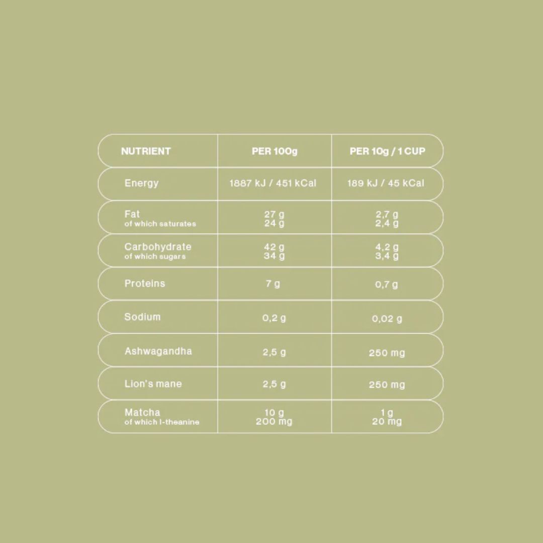 Coconut milk powder (55,4%), coconut sugar, matcha powder (10%), lion’s mane extract (2,5%), cinnamon powder (1%), ashwagandha (0,8%), flavouring.