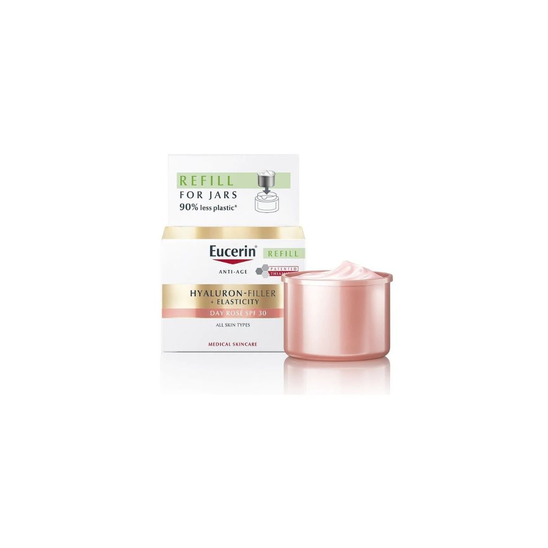 Eucerin Hyaluron-Filler + Elasticity Rosé dnevna krema SPF 30 trenutno pruža blistavost za smanjenje umornog i sivog izgleda, popunjava duboke bore, poboljšava elastičnost kože, smanjuje pigmentacije uzrokovane starenjem i trenutno vraća sjaj.