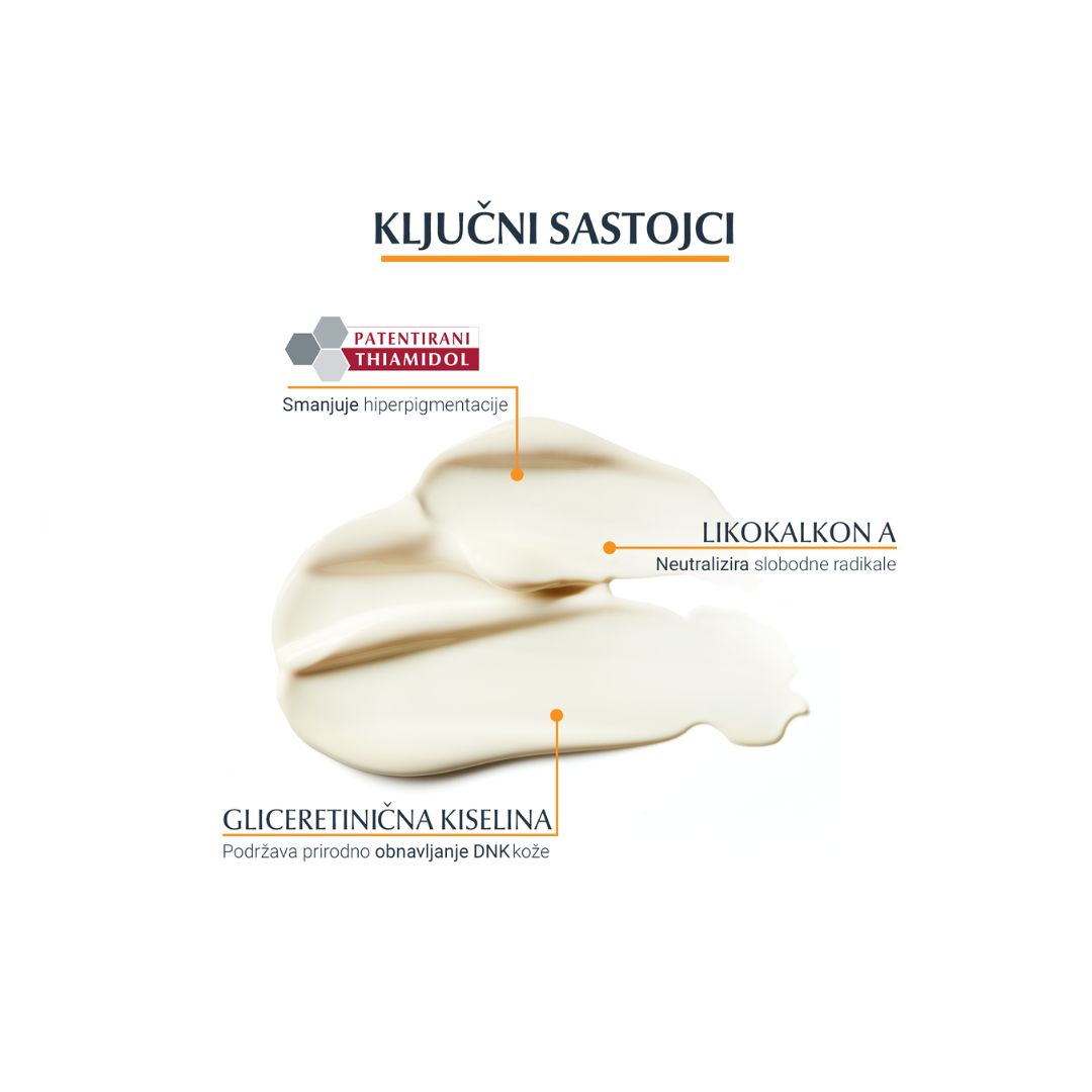 Ključni sastojak ovog fluida je Thiamidol – patentirani Eucerin sastojak koji učinkovito djeluje na glavni uzrok hiperpigmentacije. Redovitom upotrebom vidljivo smanjuje tamne mrlje i sprječava njihovo ponovno pojavljivanje.
