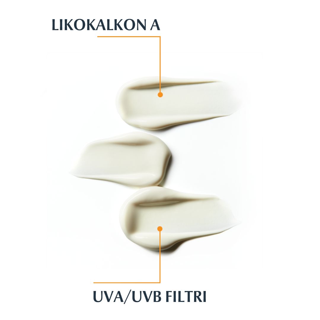 Napredna spektralna tehnologija kombinira širokopojasne i fotostabilne UVA/UVB filtre za visoku UV zaštitu s likokalkonom A. Ovaj snažni antioksidans djeluje na neutraliziranje slobodnih radikala uzrokovanih UV i HEVIS svjetlošću.