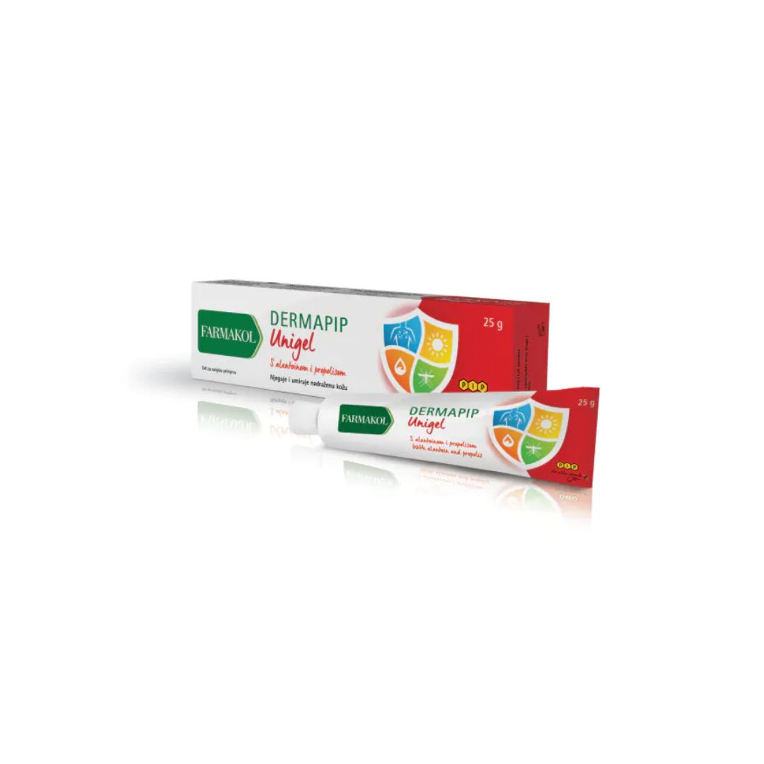 FARMAKOL Dermapip Unigel Gel s alantoinom, propolisom, ekstraktom kamilice i nevena potiče obnovu kože, umiruje i njeguje kožu, ugodno hladi, brzo se upija, ne masti. Kožu čini mekom i glatkom.