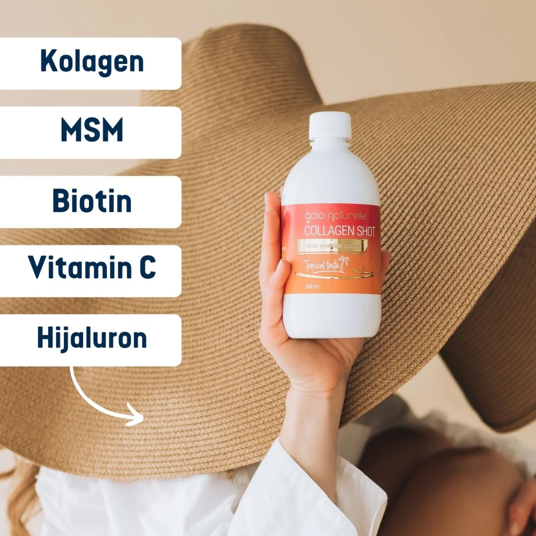 Kolagen Shot Tropical: 5 000 mg hidroliziranog kolagena, 1 500 mg MSM, hijaluronska kiselina, vitamini i tropski okus — bez šećera, za vidljive rezultate.
