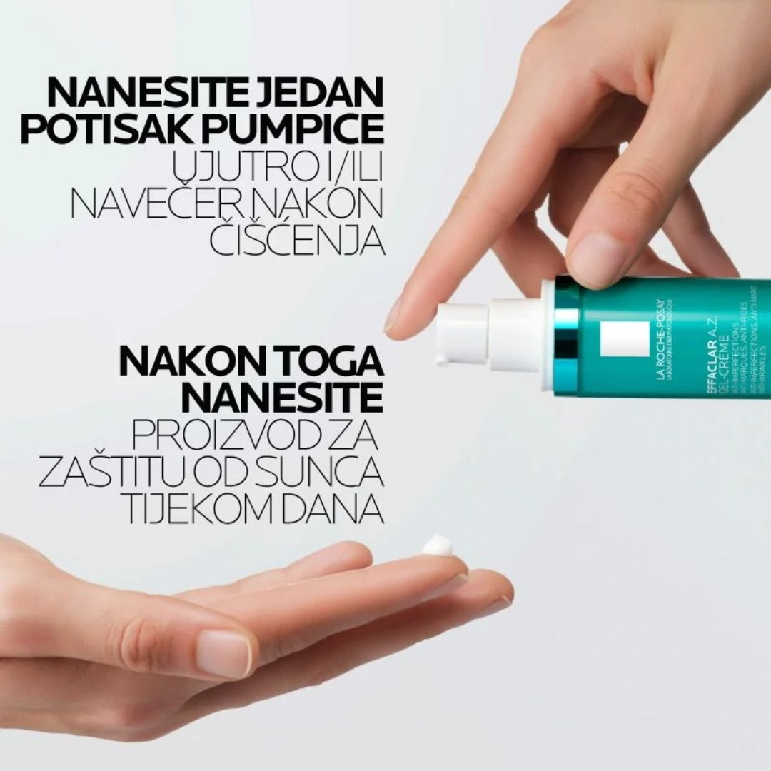 Nanesite jednu pumpicu Effaclar A.Z. gel-kreme ujutro i navečer na lice nakon kreme za čišćenje lica i dnevnog seruma. Nakon toga nanesite zaštitni faktor tijekom dana kako biste zaštitili svoju kožu. Nanesite kremu na lice prije nanošenja šminke. Izbjegavajte područje oko očiju.