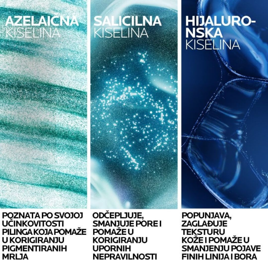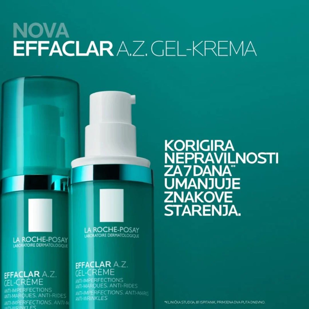 La Roche-Posay Effaclar A.Z. Gel-krema predstavlja dermatološku inovaciju za odrasle s kožom sklonom aknama. Ova visokoučinkovita njega kombinira tri dermatološki priznate kiseline – azelaičnu, salicilnu i hijaluronsku kiselinu, uz dodatak cinka, kako bi ciljala na nepravilnosti, proširene pore, tragove akni i prve bore.