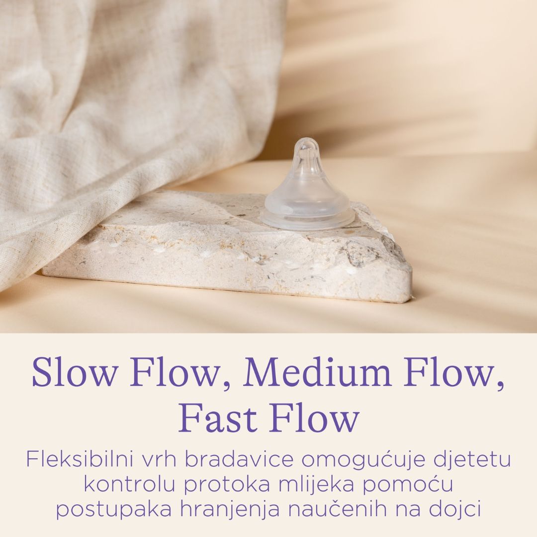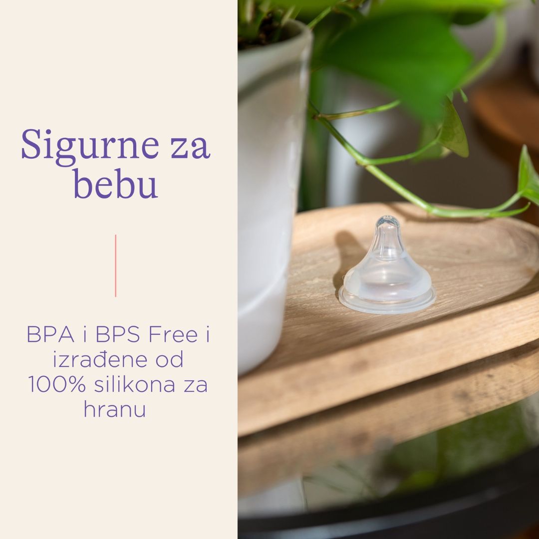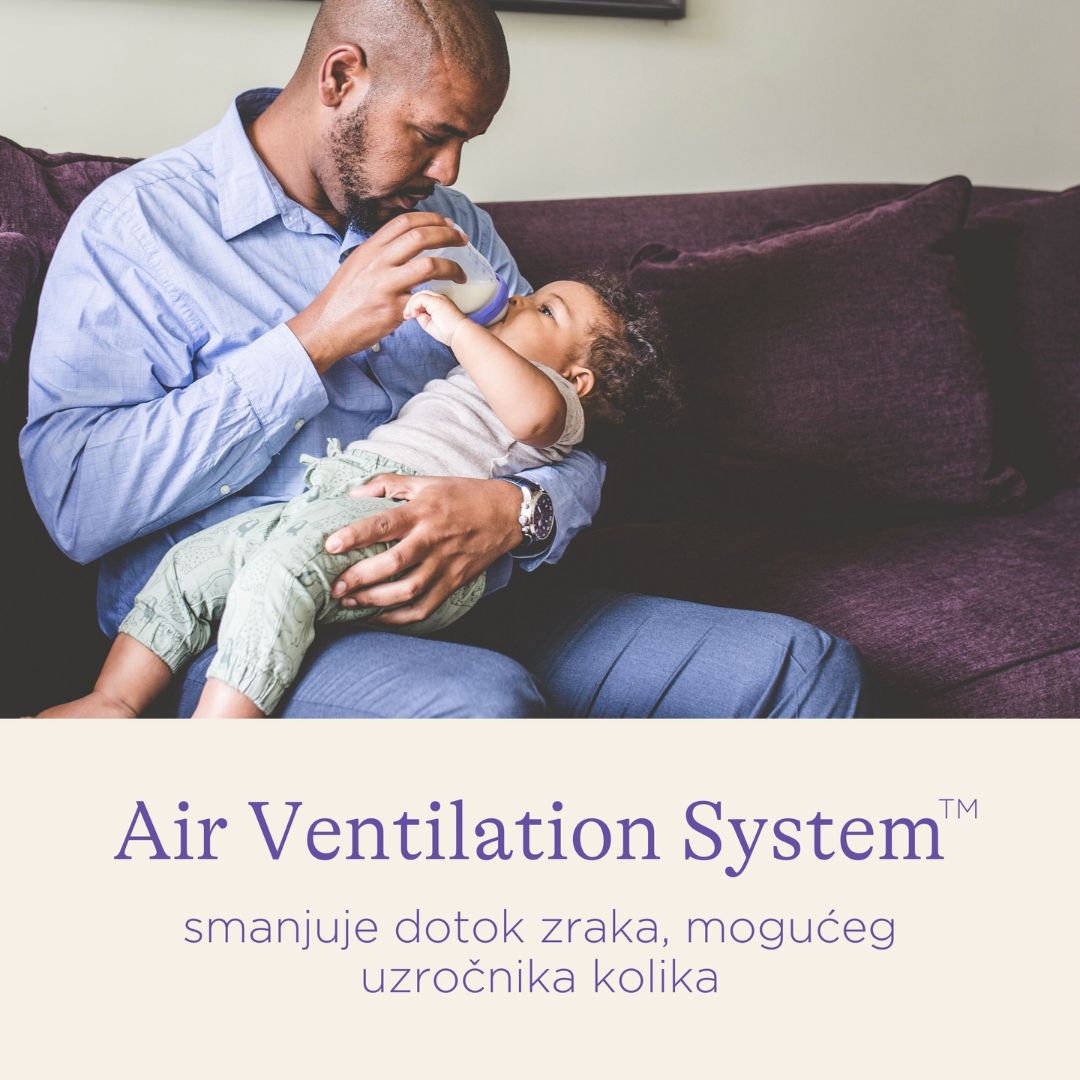 Vrh sisača omogućuje bebi da sama kontrolira protok mlijeka, slično kao kod dojenja, dok Air Ventilation System smanjuje ulazak zraka i time pomaže u smanjenju kolika, ispljuvka i nelagode.