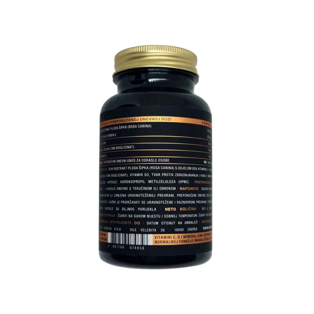 Sastojci: suhi ekstrakt ploda šipka (Rosa Canina) s udjelom 50% vitamina C, L-histidin, cink (u obliku cink bisglicinata), vitamin D3, tvar protiv zgrudnjavanja i punilo: mikrokristalna celuloza, kapsule: hidroksipropi metilceluloza (HPMC).