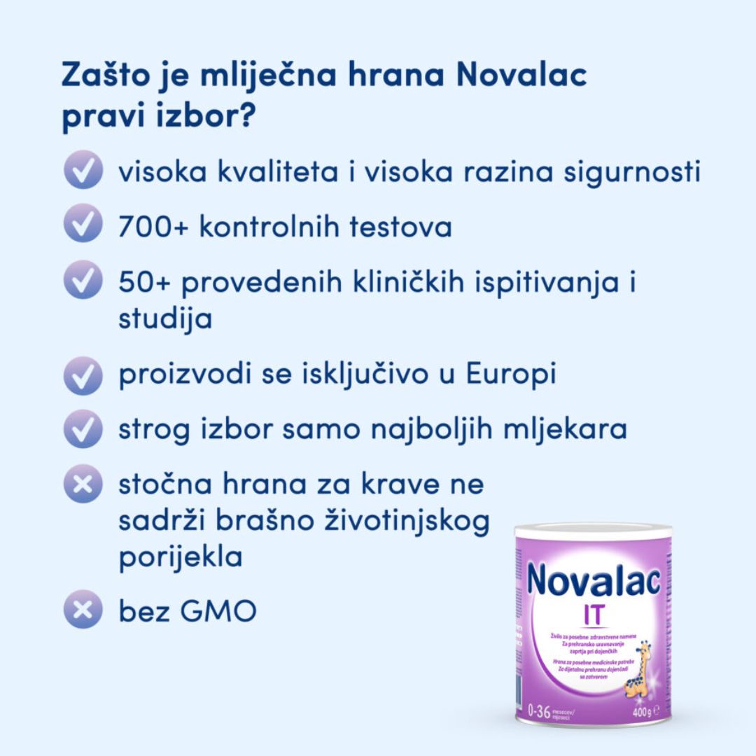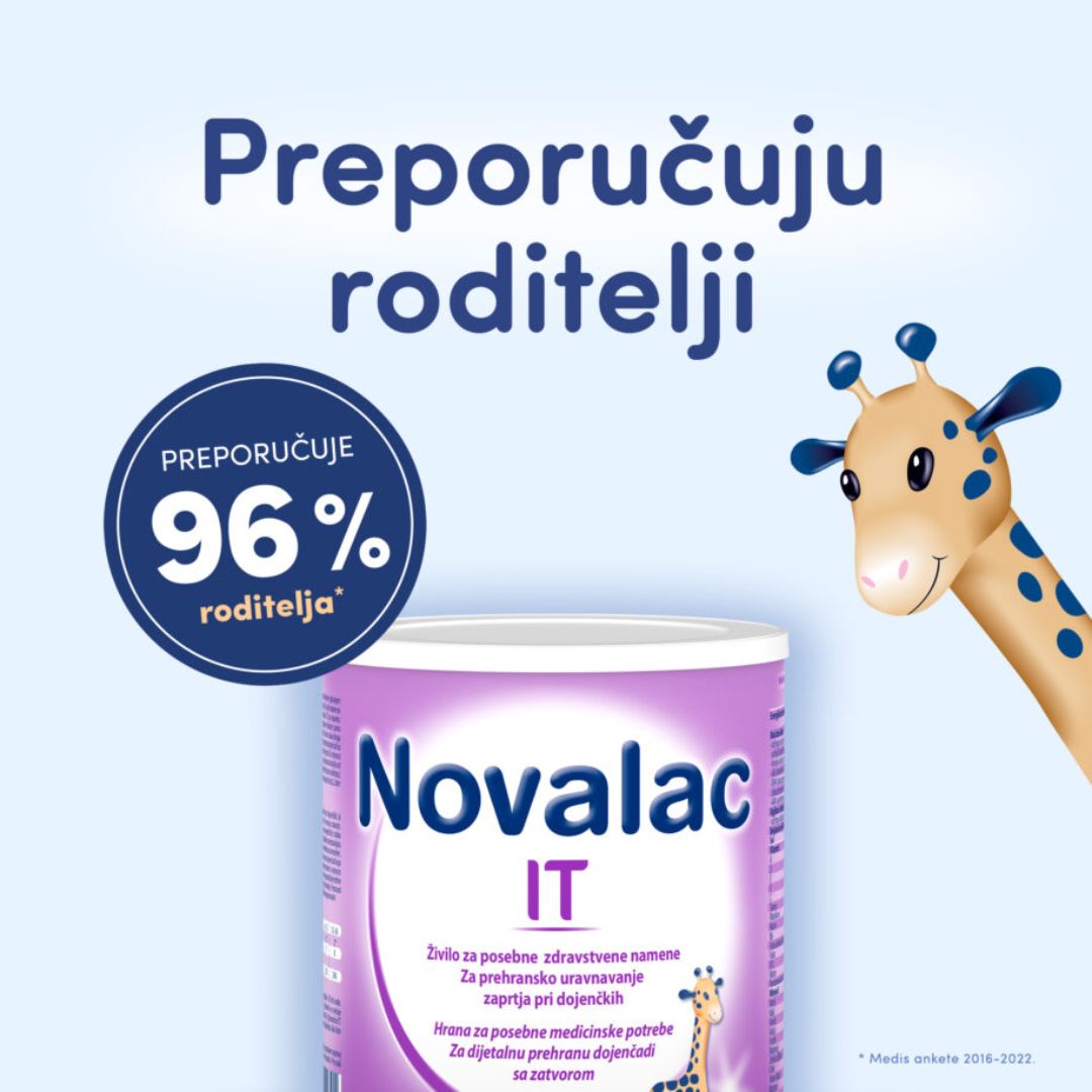 Novalac IT je hrana za posebne medicinske potrebe za dijetalnu prehranu dojenčadi sa zatvorom od rođenja do 36. mjeseca starosti.