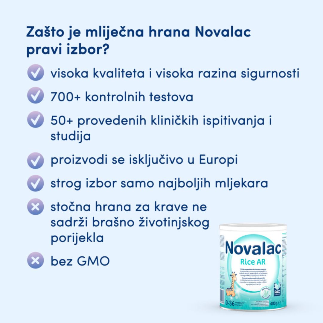 Novalac Rice AR je hrana za posebne medicinske potrebe za dijetalnu prehranu dojenčadi i male djece preosjetljive na bjelančevine kravljeg mlijeka, s regurgitacijom ili bez nje.