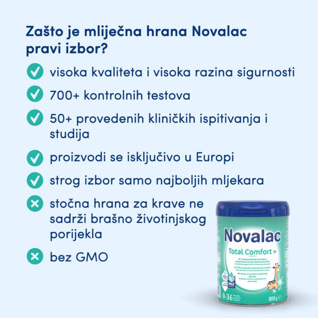 Novalac Total Comfort + je hrana od rođenja do 36. mjeseca života za zadovoljavanje prehrambenih potreba dojenčadi s probavnim poremećajima poput regurgitacije, bolova u trbuhu i plinova zbog intolerancije na laktozu, zatvora ili tvrde stolice.