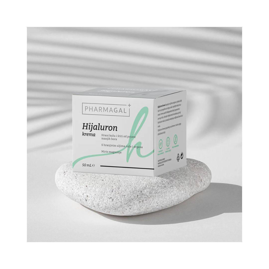 PHARMAGAL Hijaluron krema bogata je uljima argana i ploda divlje ruže te je pogodna za njegu suhe i osjetljive kože lica i vrata. Krema sadrži dekspantenol koji regenerira i umiruje kožu. Pogodna je za dnevnu i noćnu njegu dehidrirane kože.