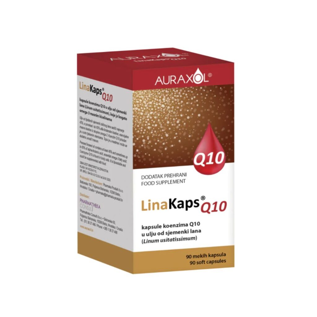 AURAXOL LinaKaps Q10 je dodatak prehrani u obliku mekih uljnih kapsula, a sadrži koenzim Q10 u ulju od sjemenki lana.