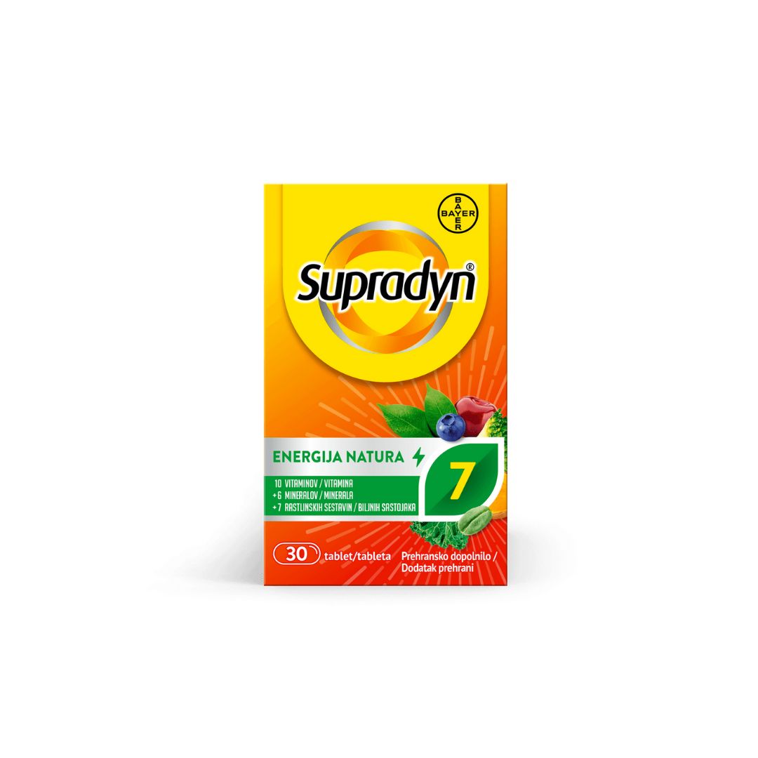 Supradyn ENERGIJA NATURA je multivitaminski dodatak s 10 vitamina, 6 minerala i S7™ biljnim kompleksom koji doprinosi stvaranju energije i smanjenju umora. Idealan je za odrasle u razdobljima stresa, umora i pojačane aktivnosti.