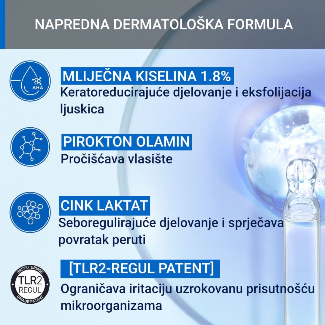 Kombinacija pirokton olamina i cinkovog laktata doprinosi kontroli čimbenika povezanih s pojavom peruti te pomaže održati vlasište čistim i uravnoteženim.