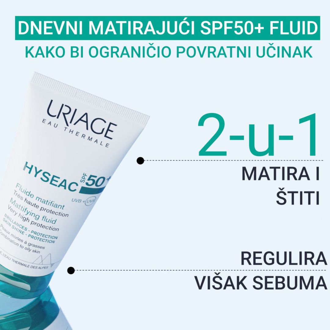 URIAGE HYSEAC Emulzija SPF50+ za masnu i mješovitu kožu lica pruža vrlo visoku zaštitu od sunca, hidratizira i matira mješovitu i masnu kožu laganom, nemasnom teksturom.