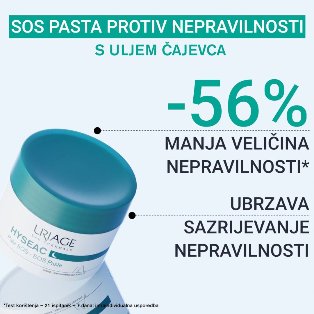 URIAGE HYSEAC SOS pasta za lokalnu njegu pomaže isušiti i umiriti kožu sklonu nepravilnostima te poboljšava njezin izgled već tijekom noći.