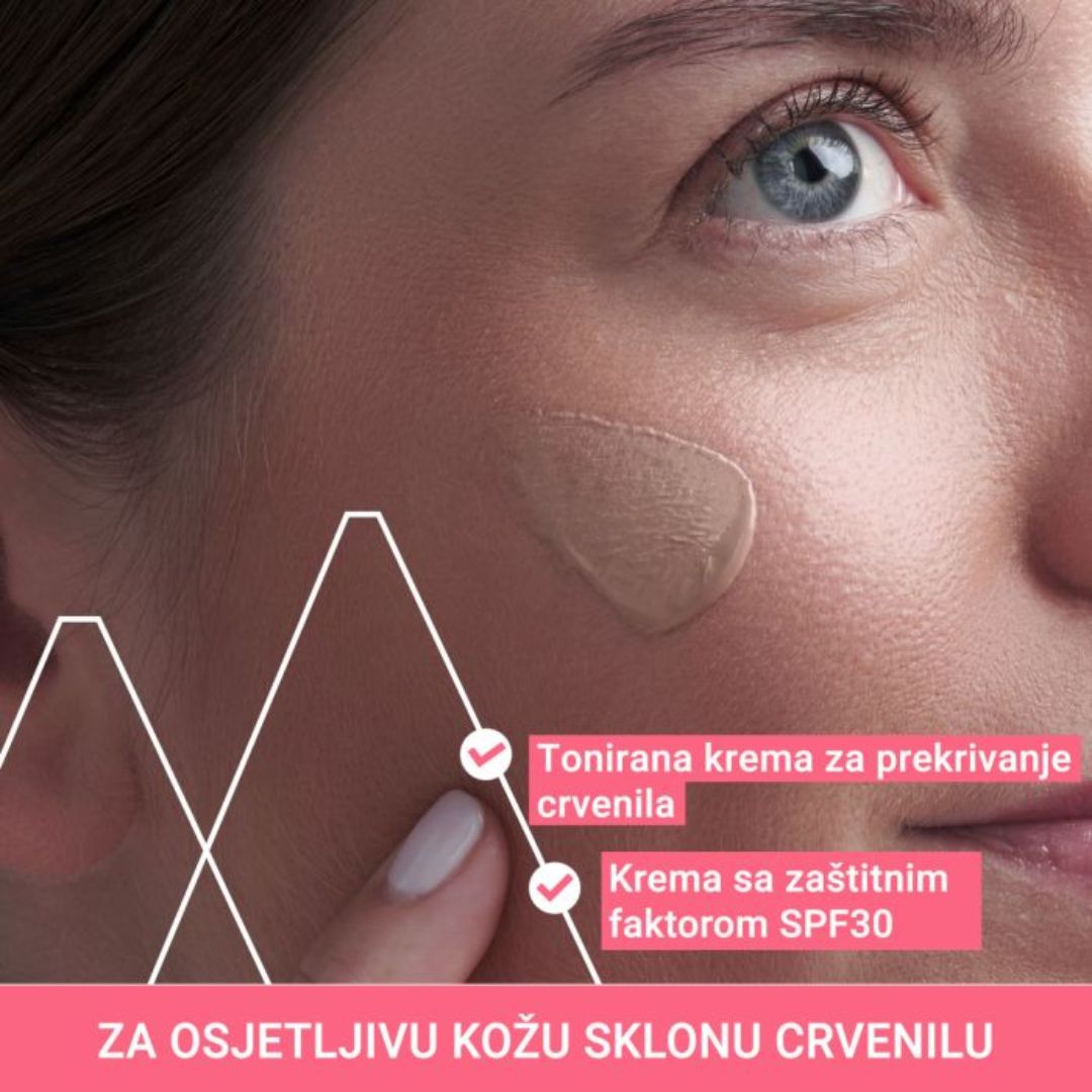 Ugrađeni UVA/UVB filteri (SPF30) pružaju učinkovitu zaštitu od sunca, što je posebno važno kod kože sklone crvenilu i reaktivnosti.
