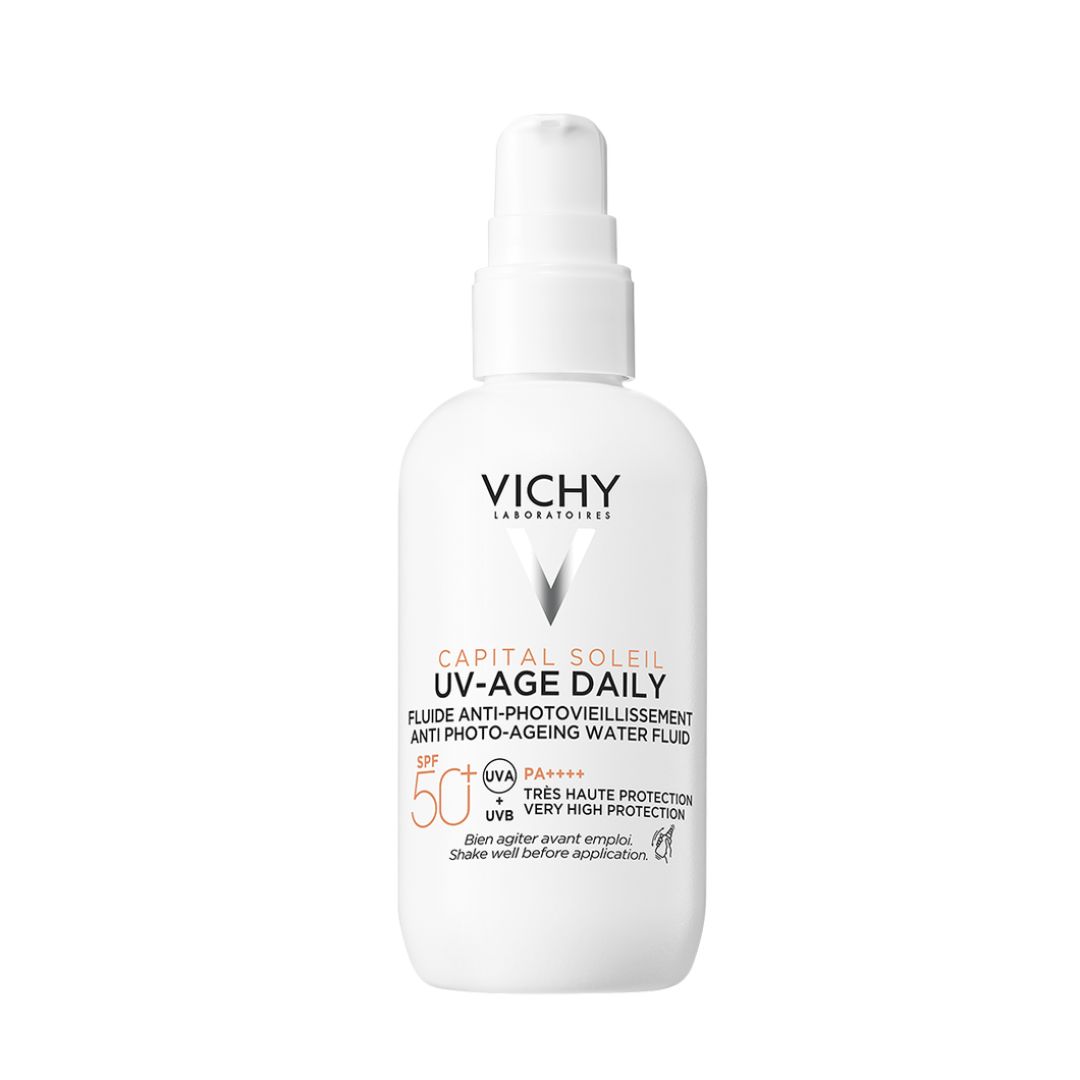 VICHY CAPITAL SOLEIL UV-AGE DAILY vodeni fluid protiv fotostarenja SPF 50+ zajedno s peptidima pruža naprednu UV zaštitu protiv starenja.
