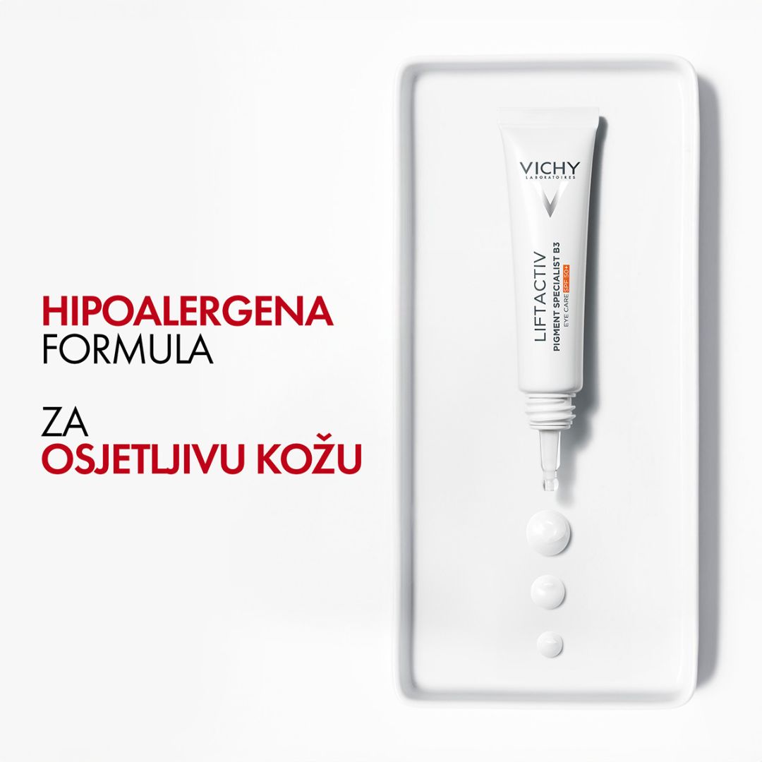 VICHY LIFTACTIV Pigment Specialist B3 krema za područje oko očiju SPF 50+ ciljano djeluje na podočnjake i hiperpigmentacijske mrlje. Pogodno za osjetljivu kožu.