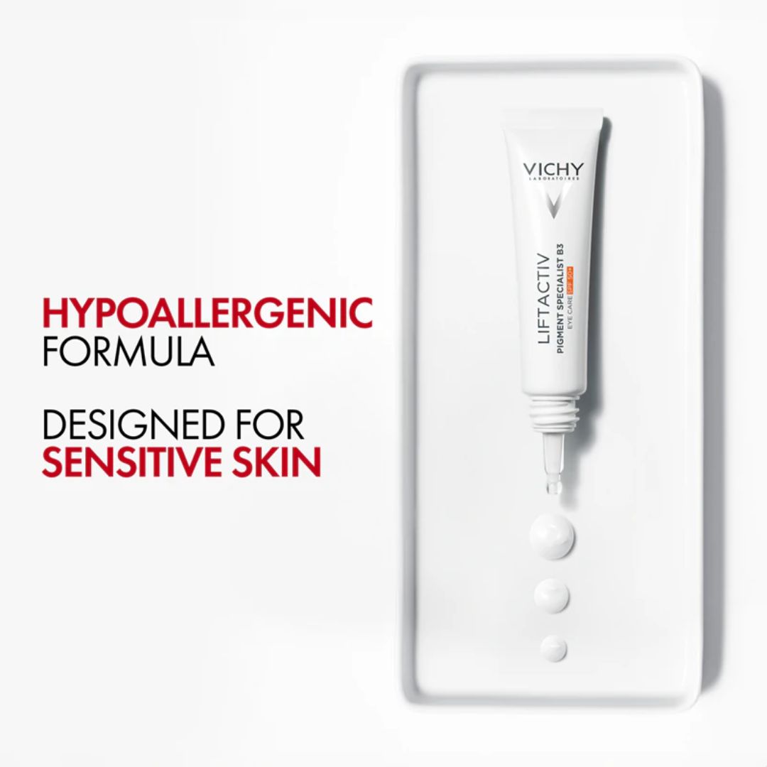 Vichy Liftactiv Pigment Specialist B3 krema za područje oko očiju SPF 50+ 15 ml idealan je izbor za sve koji žele svježiji, odmorniji i ujednačeniji izgled područja oko očiju, uz snažnu zaštitu od sunca i laganu, ugodnu teksturu za svakodnevnu upotrebu.