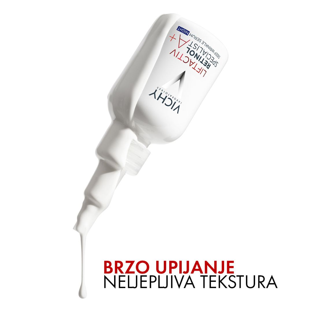 VICHY LIFTACTIV Retinol Specialist serum zaglađuje duboke i vidljive bore te obnavlja površinu kože. Pospješuje obnovu stanica, vraća koži gustoću i smanjuje pojavu sitnih linija i bora. Koža je zaglađenija, blistava i obnovljena.​