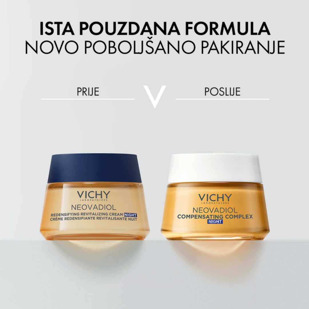 Vichy Neovadiol Compensating Complex noćna krema dio je Neovadiol linije, koja je rezultat dermatološkog iskustva i fokusirana je na uravnoteženu njegu zrele kože u sklopu svakodnevne rutine.