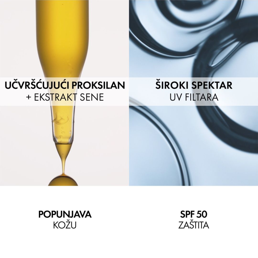 Ova dermatološki razvijena formula kombinira visoku UV zaštitu SPF50 sa sastojcima koji pomažu u očuvanju elastičnosti, čvrstoće i ujednačenog izgleda tena kože.