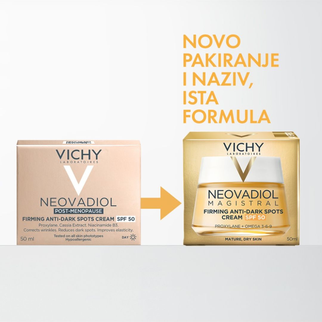 Vichy Neovadiol Magistral dnevna krema sa SPF50 dio je Neovadiol linije, koja je rezultat dugogodišnjeg dermatološkog iskustva i razvoja, osmišljena kako bi ponudila uravnoteženu njegu za specifične potrebe zrele kože.