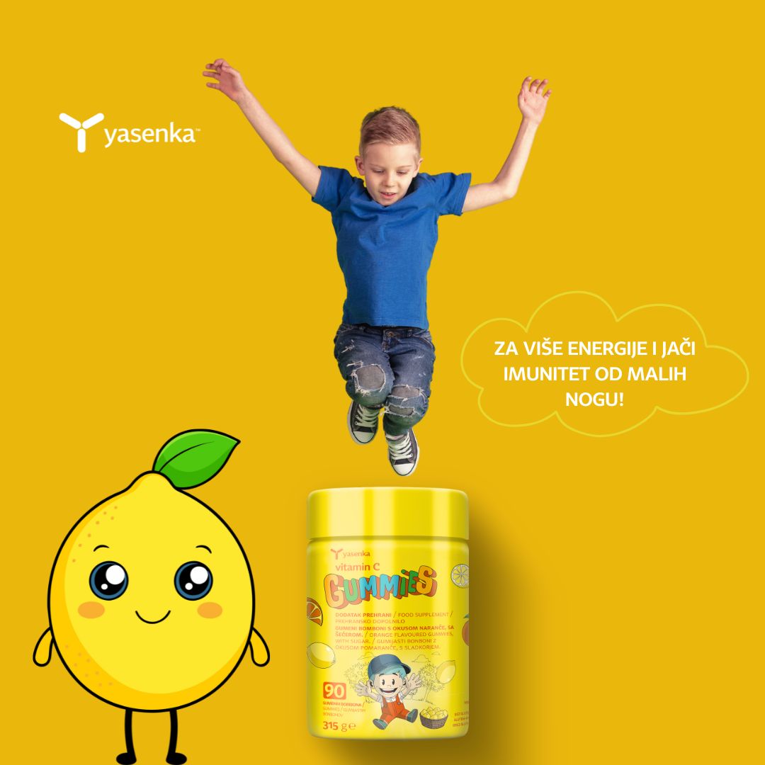Yasenka VITAMIN C GUMMIES predstavljaju zabavan, ukusan i praktičan oblik unosa vitamina C, u obliku gumenih bombona s prirodnim okusom naranče. Za djecu i odrasle. Svaki gumeni bombon donosi 100% preporučenog dnevnog unosa vitamina C.